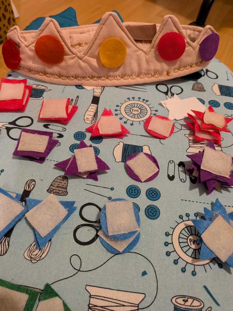 J’ai confectionné mes couronnes en tissu avec du scratch et j’ai découpé des « bijoux » en feutrine à la cricut. J’ai collé les scratchs sur les bijoux au pistolet à colle